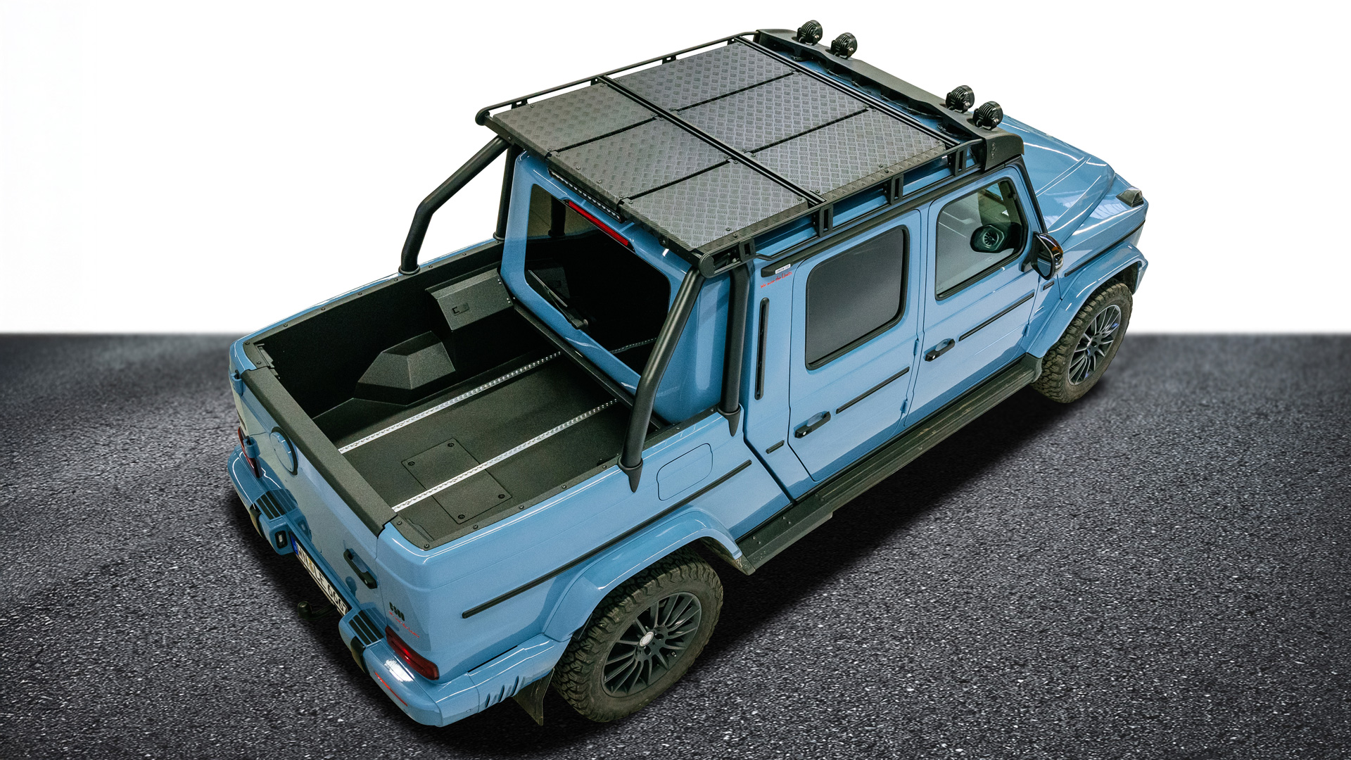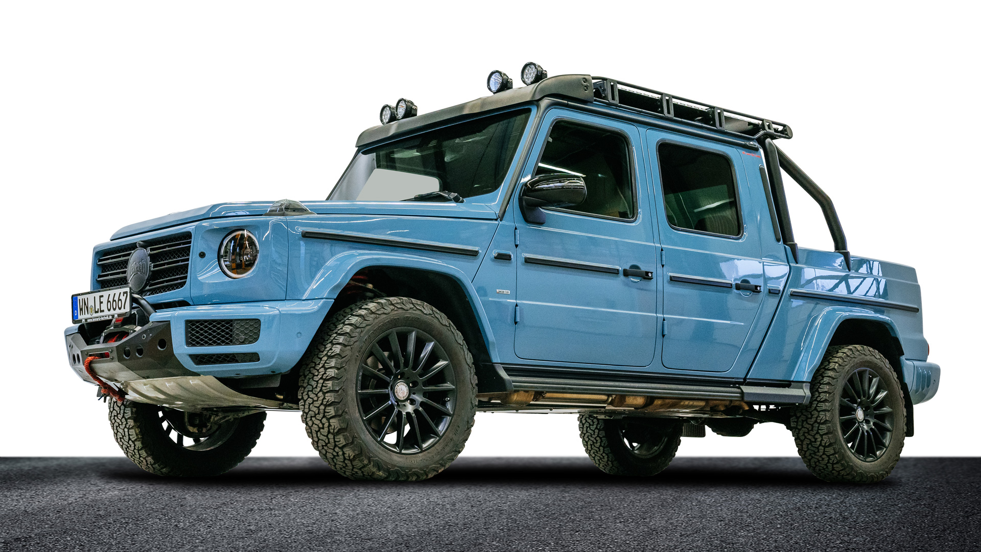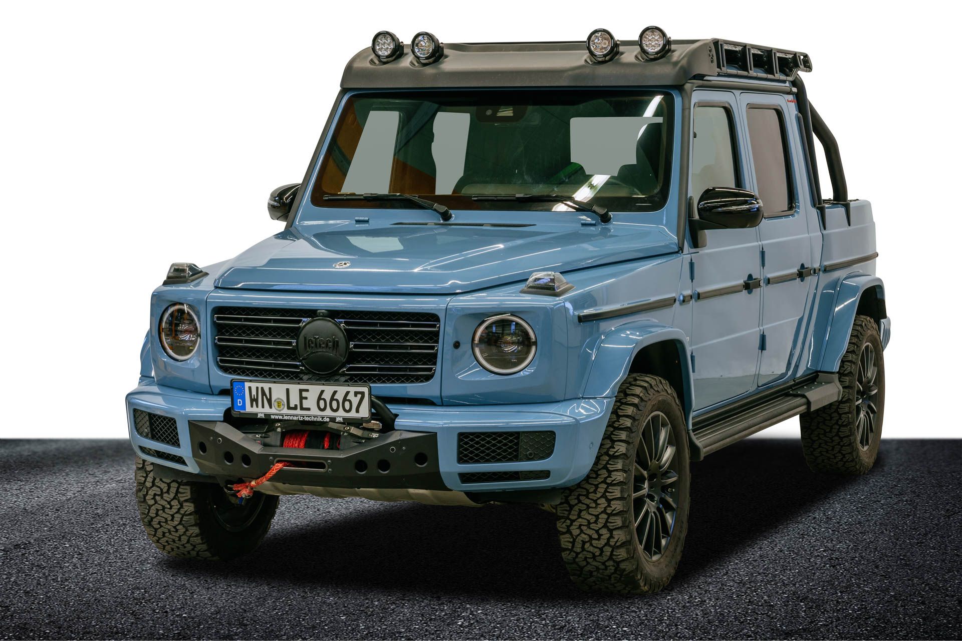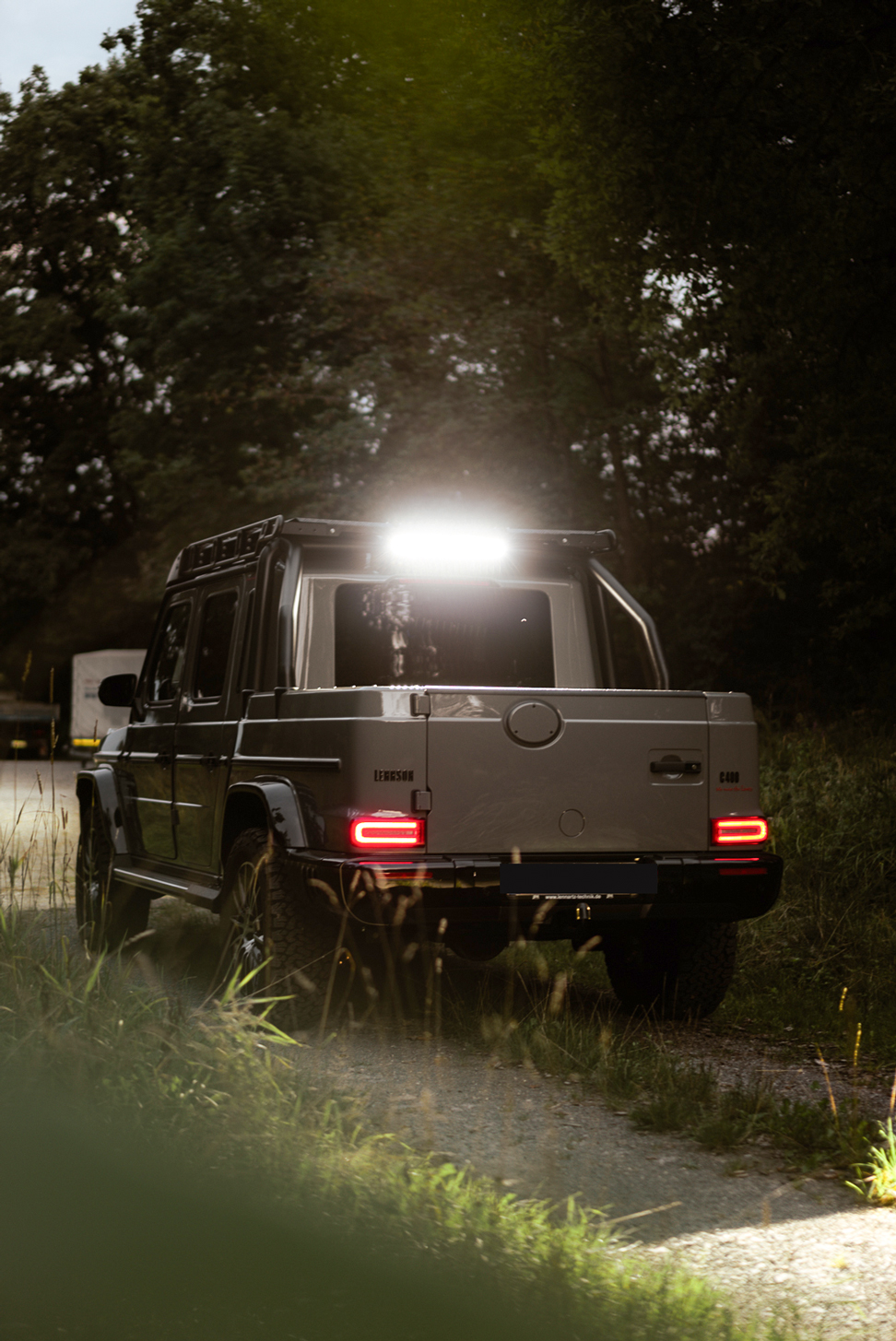 The LENNSON C Pick-Up is a special model based on the Mercedes-Benz G-Class. The standard G-Class is transformed into a functional pickup with a generous loading area. The vehicle frame is extended by 500 mm, increasing the overall length to 5,375 mm and the wheelbase to 3,390 mm. The result: significantly more loading space, ideal for trade, leisure, or off-road use.