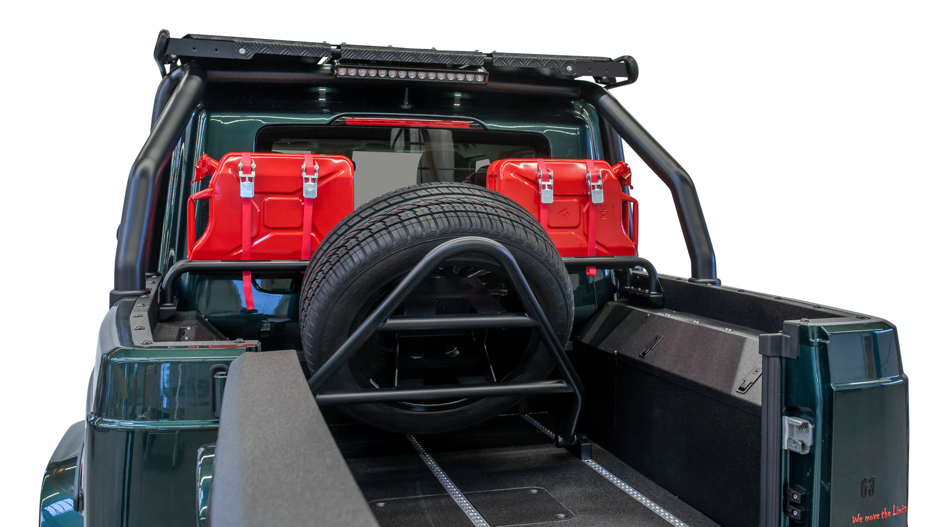 The loading area measures 1,200 x 1,120 mm (L x W) and offers sufficient space for tools, materials, or leisure equipment. Optionally, it can be equipped with integrated storage compartments for additional storage space or with a roll cover that offers optimum protection against weather and theft. Two variants are available for the spare wheel: a standing spare wheel holder on the loading area or mounting on the tailgate.